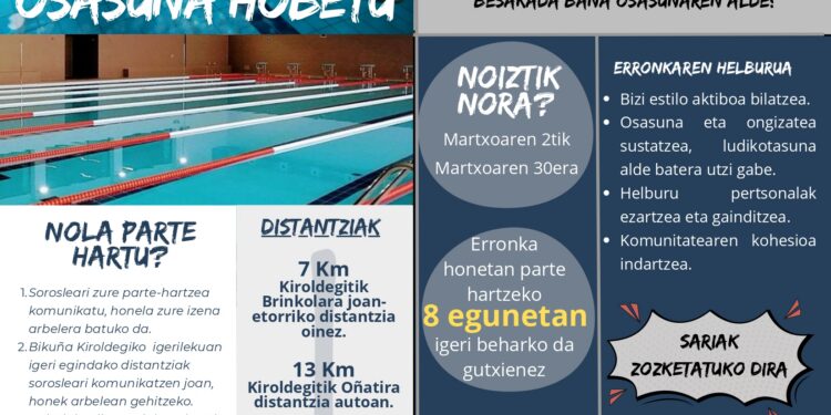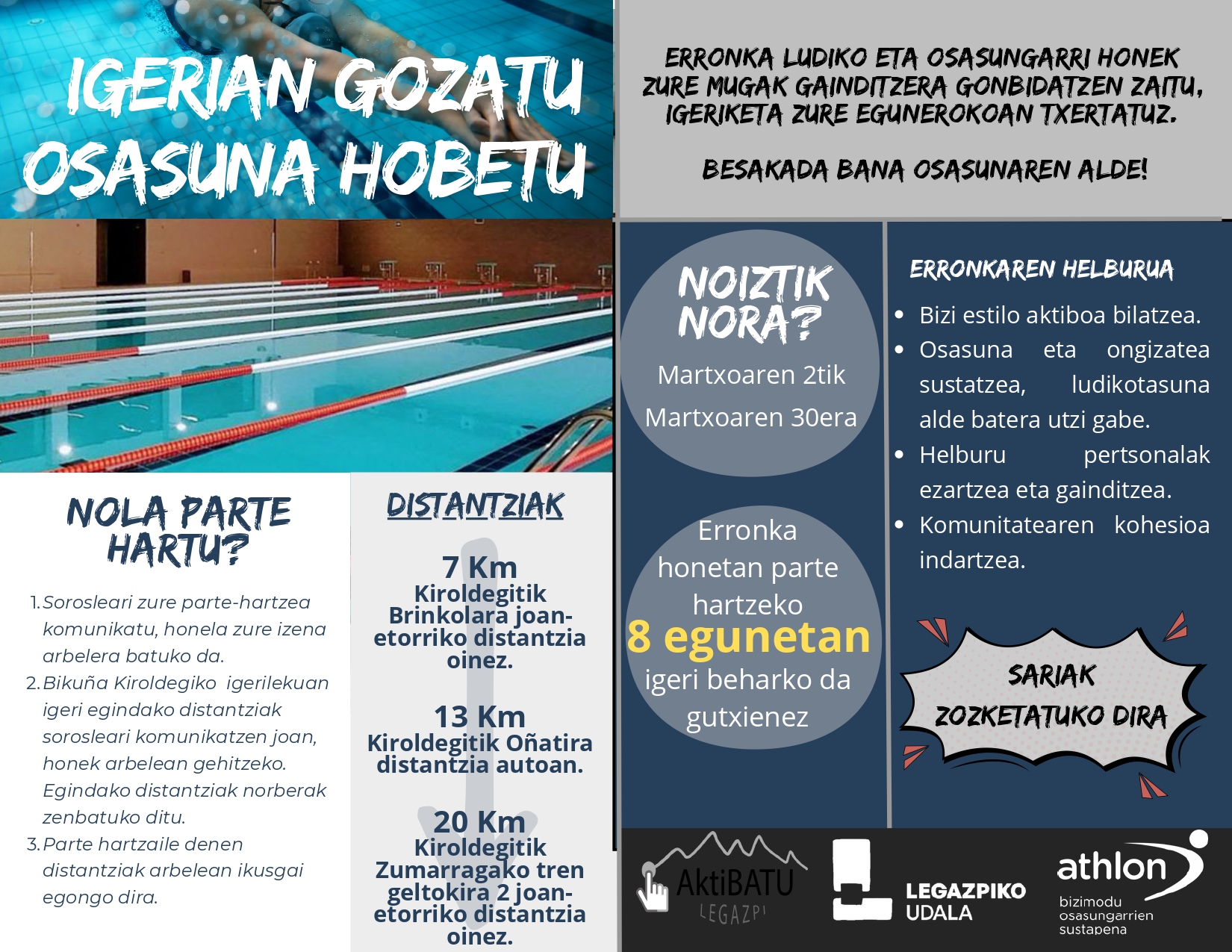 Dentro de la iniciativa Aktibatu Legazpi, del 2 al 30 de marzo se ha puesto en marcha el Reto de la Piscina en el Polideportivo Bikuña. Esta actividad se ha organizado con el objetivo de fomentar la práctica de la natación entre los ciudadanos y promover la salud. Aquellos que deseen participar deberán acumular la distancia nadada a diario, y para ello, deberán inscribirse con el socorrista.