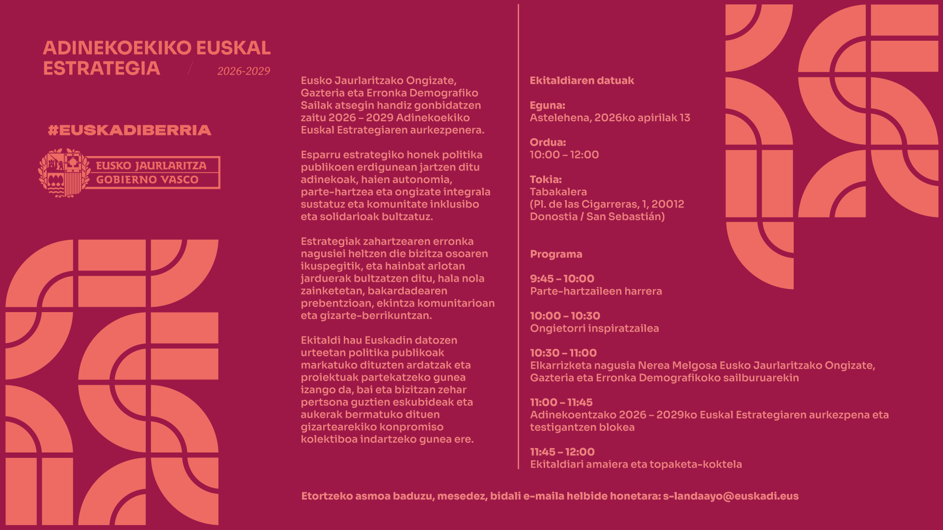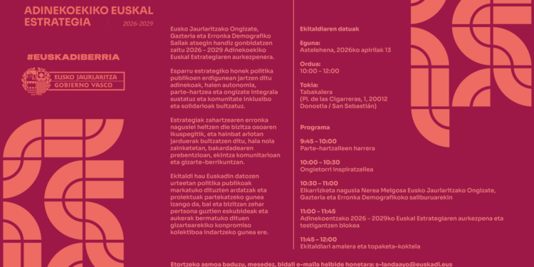 El próximo 13 de abril de 2026, el Gobierno Vasco presentará en San Sebastián la Estrategia Vasca para Personas Mayores 2026-2029. El evento se llevará a cabo en Tabakalera, organizado por el Departamento de Bienestar, Juventud y Reto Demográfico, y su objetivo es situar a las personas mayores en el centro de las políticas públicas.