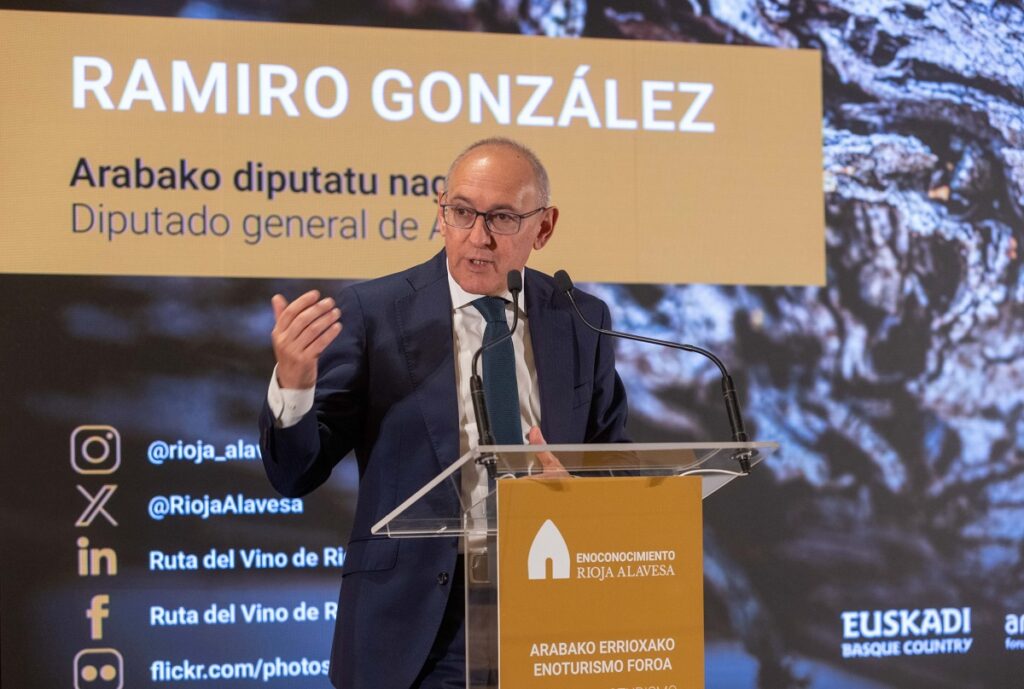 Vitoria-Gasteiz, 16 de abril de 2026. Ramiro González, diputado general de Álava, ha inaugurado hoy el XVI. Foro de Enoturismo de la Rioja Alavesa, que se celebra en la bodega Marqués de Riscal de Eltziego. En su discurso, ha subrayado la importancia del enoturismo para el futuro de la región y se debatirá sobre los próximos pasos a seguir en el sector. En esta edición del foro, se reunirán expertos y profesionales para trabajar en innovación, sostenibilidad y la identidad de la marca. Ramiro González también recordó de manera especial a Juanma Lavin, destacando su gran contribución al enoturismo de la Rioja Alavesa. Ha enfatizado que el enoturismo ayuda a diversificar la actividad económica y a fortalecer la imagen del territorio.