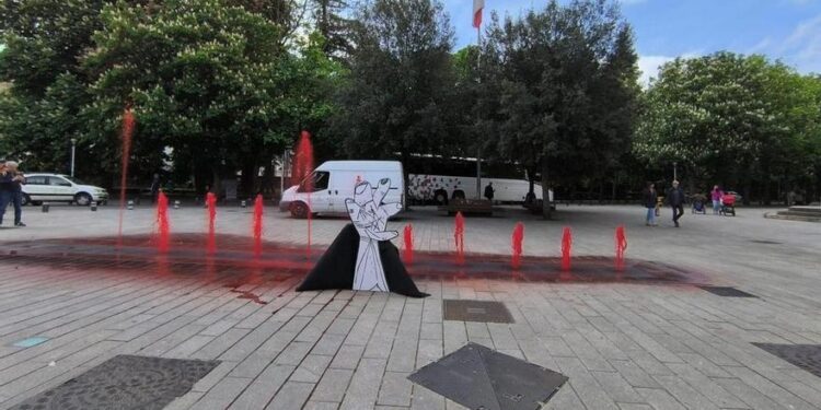 Hoy, 23 de abril, la fuente de la plaza de la catedral de Vitoria-Gasteiz se ha teñido de un color rojo vivo. No es un hecho aislado, ya que la fuente de la plaza Moyua de Bilbao también ha aparecido esta mañana con el mismo color.